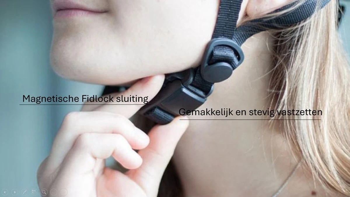 De helm is uitgevoerd met een Fidlock magneetsluiting waardoor de helm gemakkelijk met een hand los en vast is te maken.