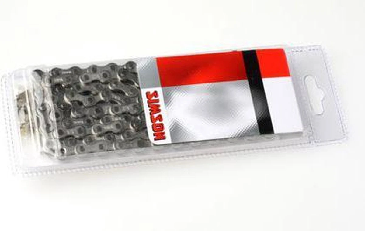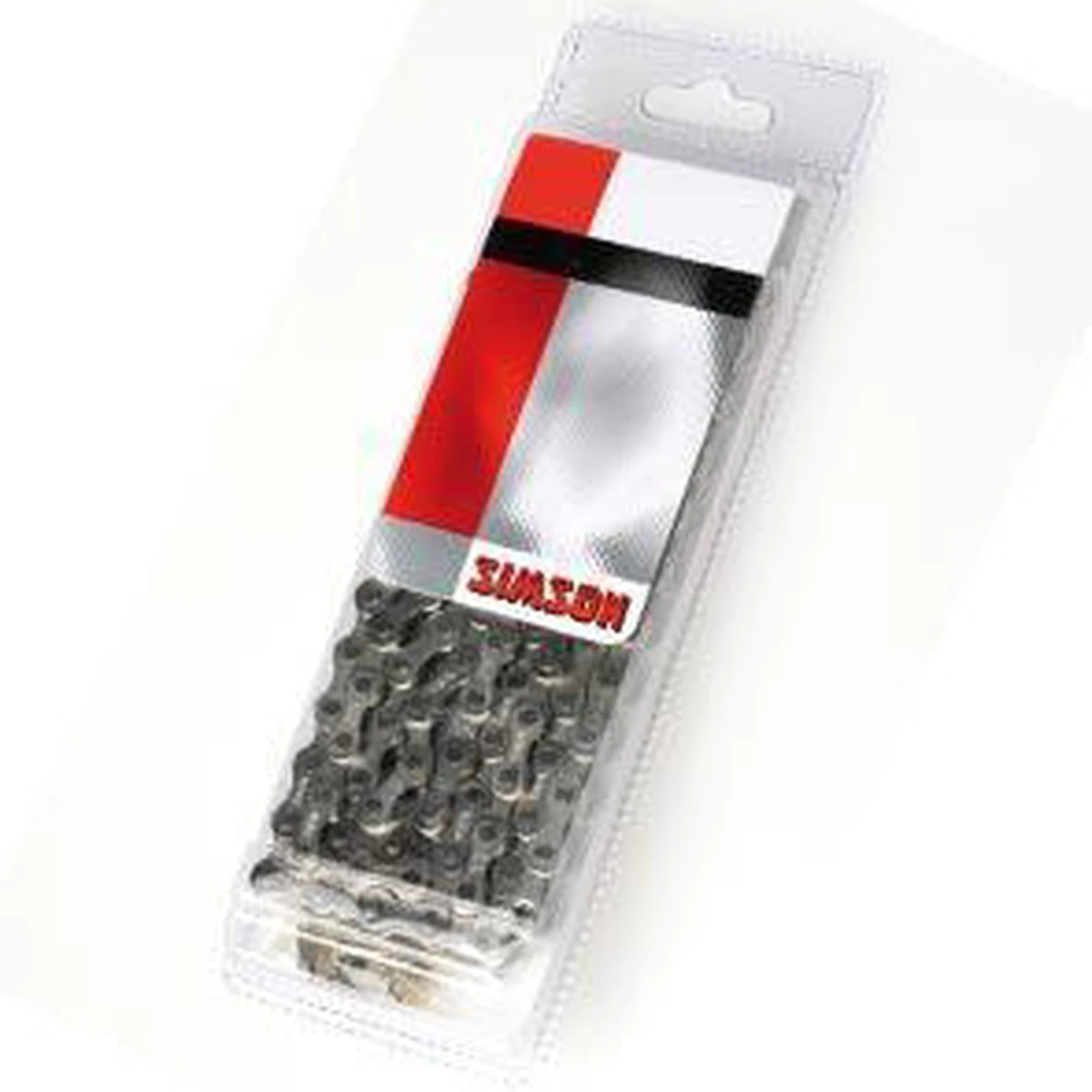 De Simson Ketting Normaal Strong is een kwalitatief hoogwaardige extra sterke fietsketting geschikt voor stadsfietsen zonder versnelling en fietsen met een naafversnelling van SACHS of Sturmey Archer. Deze ketting heeft 112 schakels en een maat van 1/2 “x 1/8”. De ketting is op maat te maken met behulp van een Simson kettingpons. Leg de ketting over de tandwielen en sluit met behulp van een punttang de uiteinden van de ketting en de bijgeleverde verbindingsschakel aan elkaar. Productspecificaties: Singlespeed extra sterk 1/2″x 1/8″ 112 link