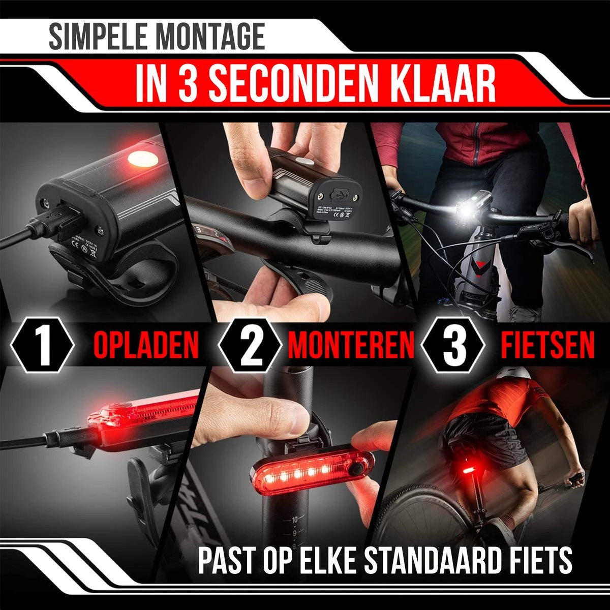 Het duurt slechts enkele seconden om de lampen te monteren zonder gereedschap, draden, schroeven of extra batterijen en accessoires. Naast het gebruik van de lampen op fietsen zijn deze ook geschikt voor gebruik op helmen, scooters, kinderwagens en rolstoelen. Gemakkelijk verwijderbaar voor opslag en opladen.