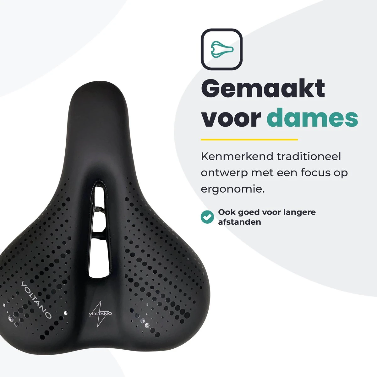 Het zadel is 100% waterdicht. Hierdoor hoeft u zich geen zorgen te maken over een natte broek. Voltano geeft hier altijd minimaal 12 maanden garantie op.